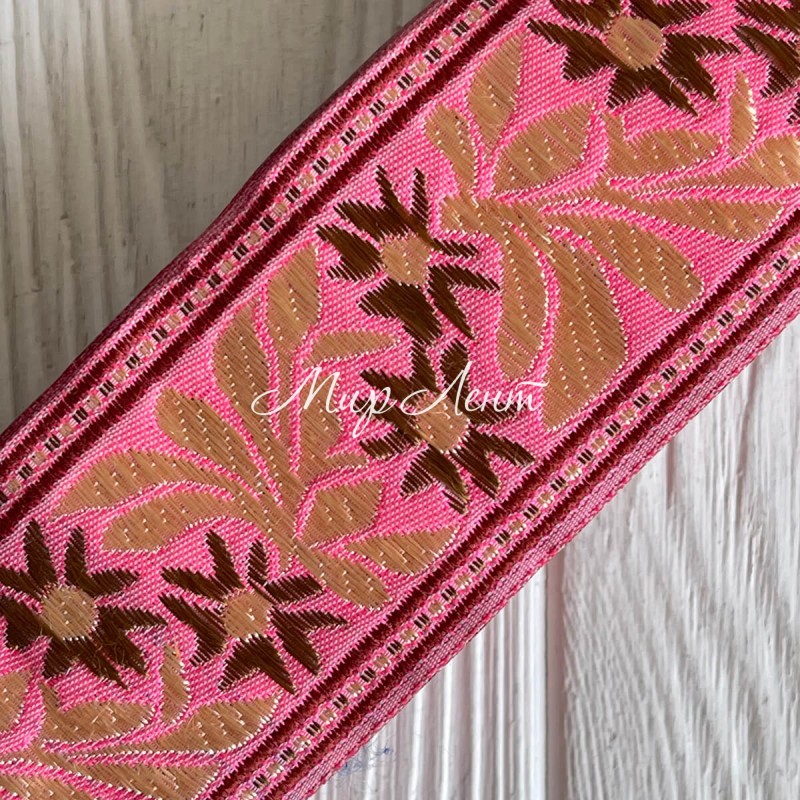 Тесьма вышиванка (барвинок), 5 см, карамельно-молочный на ярко-розовом, рулон 9 м