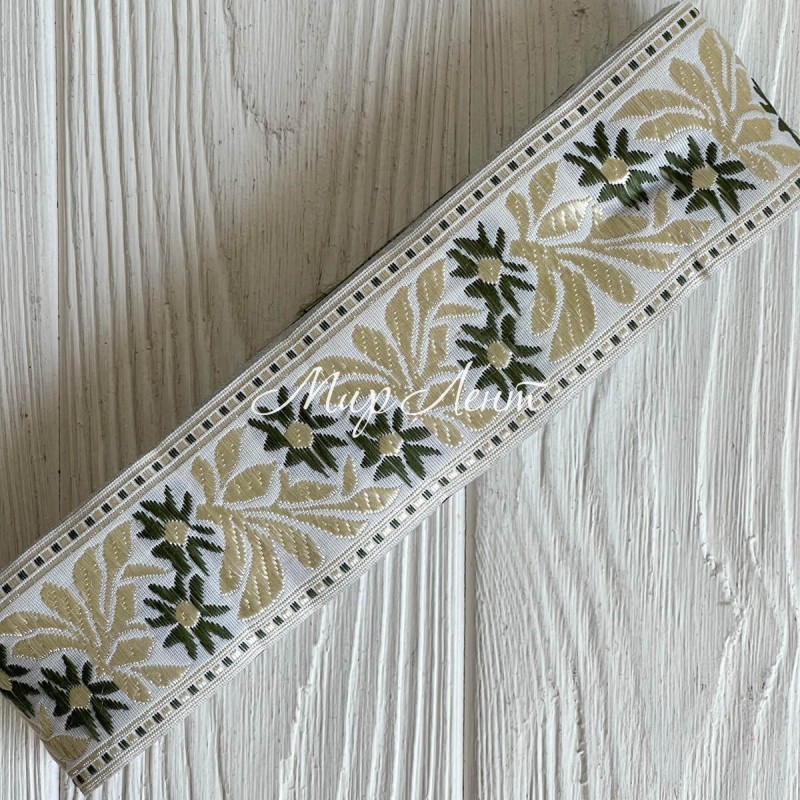 Тесьма вышиванка (барвинок), 5 см, оливково-бежевый на молочном, рулон 9 м