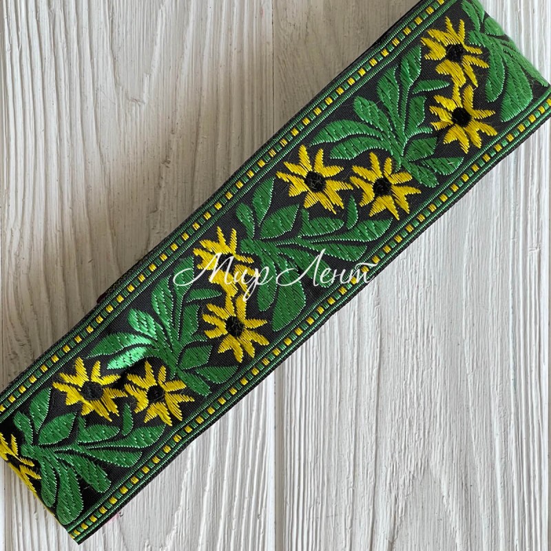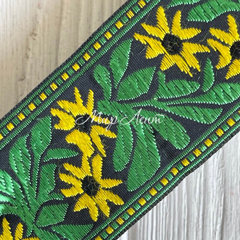 Тесьма вышиванка (барвинок), 5 см, желто-зеленый на черном, рулон 9 м