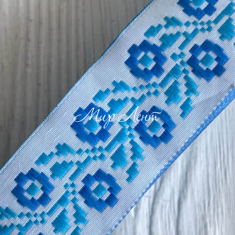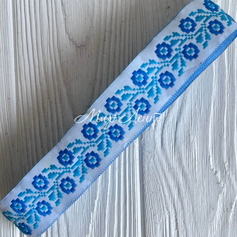 Тесьма вышиванка (средняя), 3,3 см, с вышитыми синими розами на белом, рулон 9 м