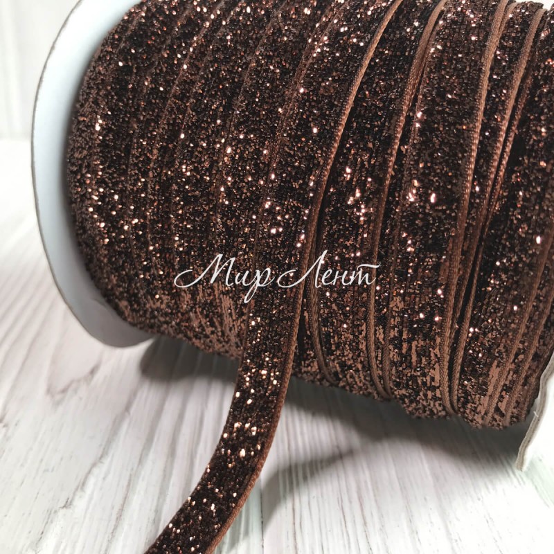 Стрічка велюр з люрексом, 1 cм, шоколадний, рулон 45 м