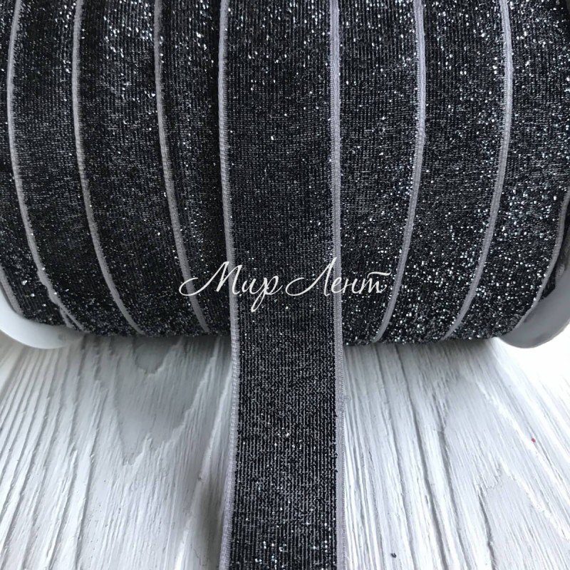 Стрічка велюр з люрексом, 2,5 см, графітовий, рулон 45 м