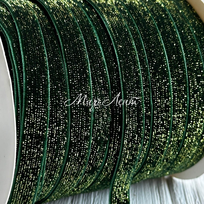Стрічка велюр з перламутром, 1 cм, темно-зелений, рулон 45 м