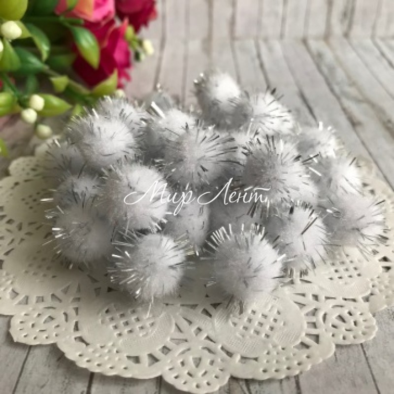 Помпони з люрексом, 1,5 см, білий з сріблом, упаковка 1000 шт.