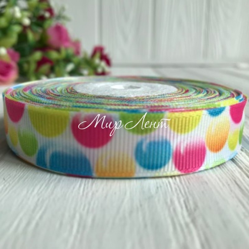 Репс 1,5 см, різнокольорові кола на білому, рулон 23 м