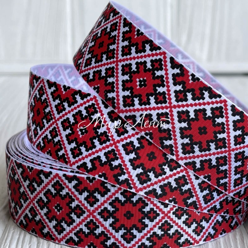 Репс 2,5 см, орнамент ромб, на червоному, рулон 23 м