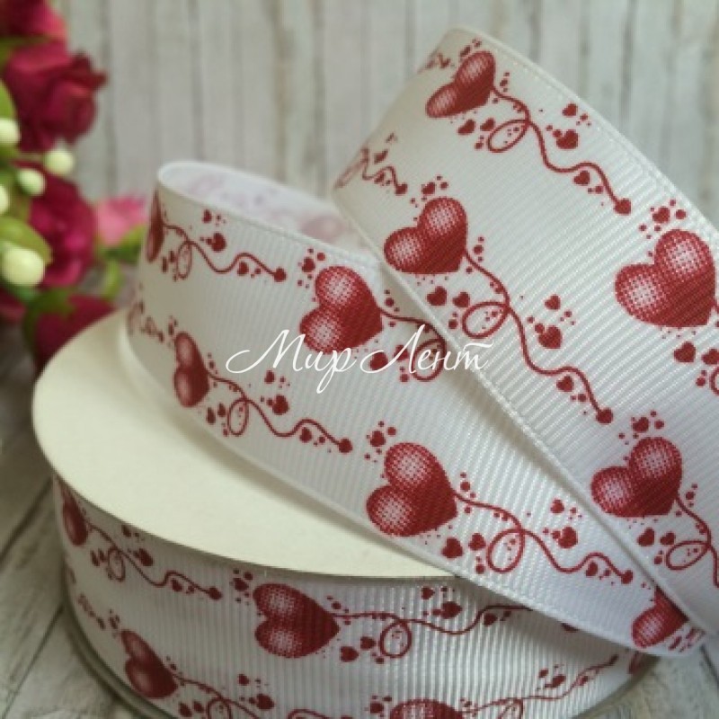 Репс 2,5 см, візерунок з сердечок, бордовий, рулон 23 м