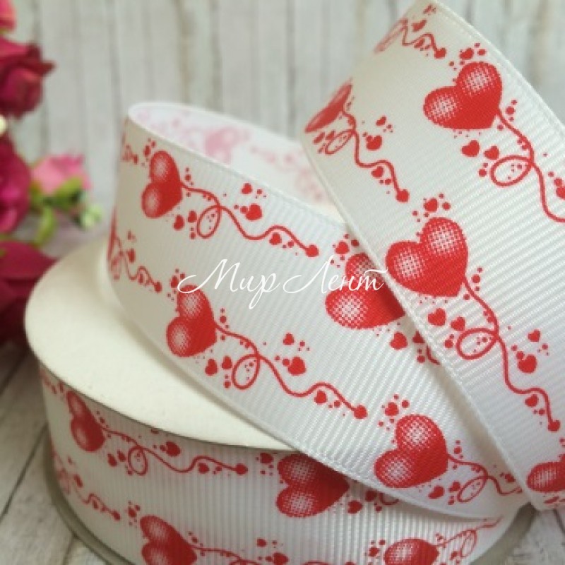 Репс 2,5 см, візерунок з сердечок, червоний, рулон 23 м