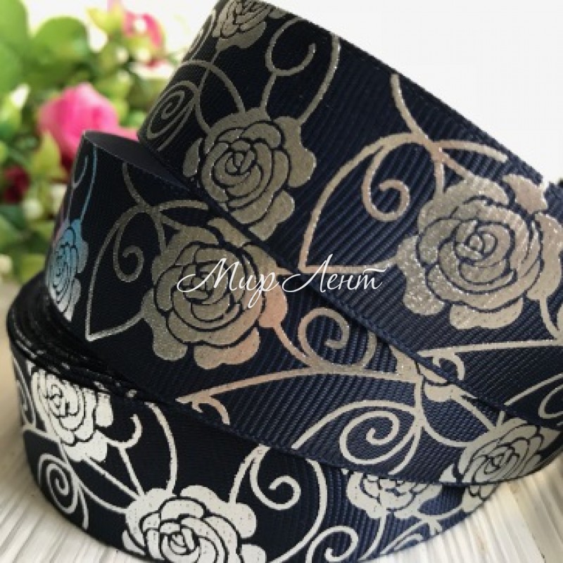 Репс 2,5 см, троянда-голограма срібло на сапфірове, рулон 23 м