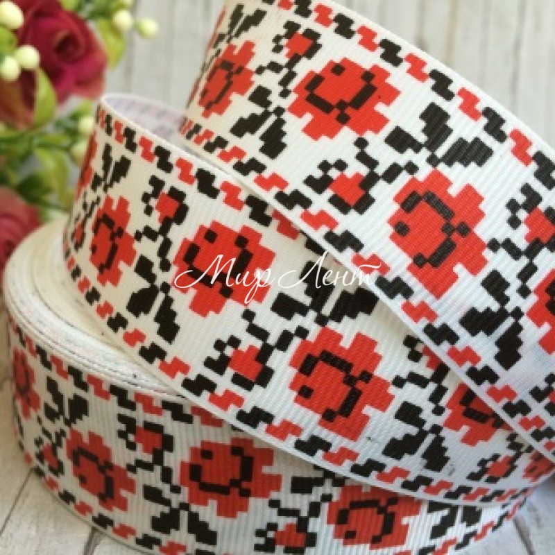 Репс 2,5 см, з вишитими кораловими трояндами, білий, рулон 23 м