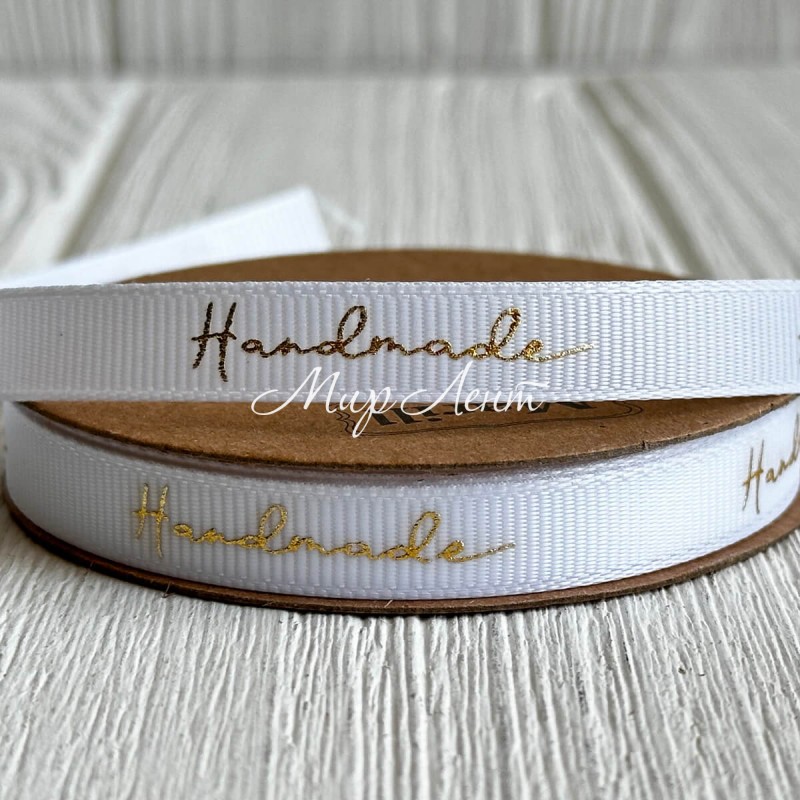 Репс з золотим надписом Handmade, 1 см, білий, рулон 23 м