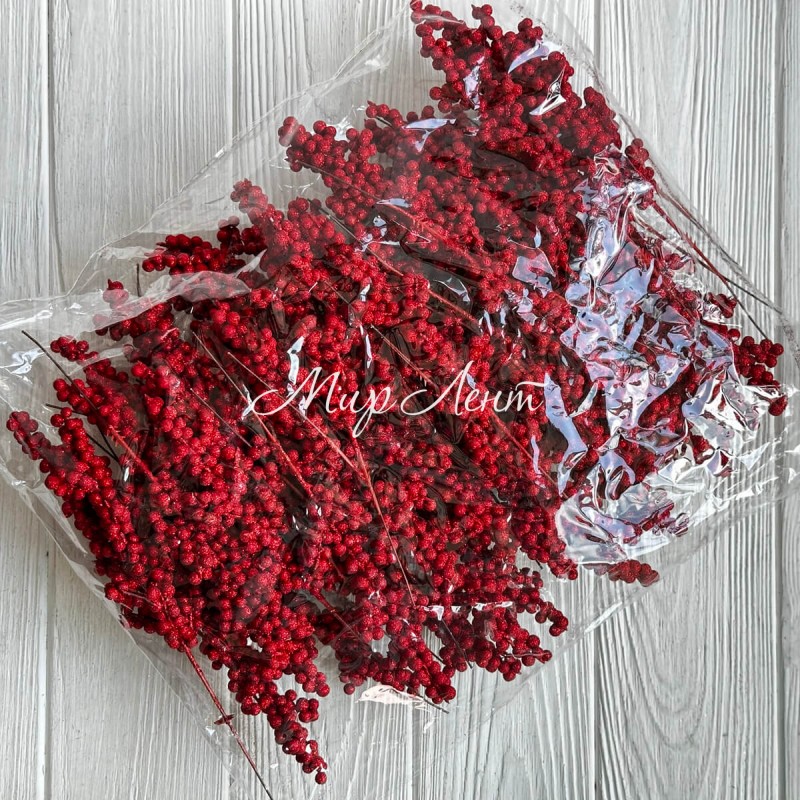 Веточка калины с глиттером, 20 см, красная, упаковка 50 шт.